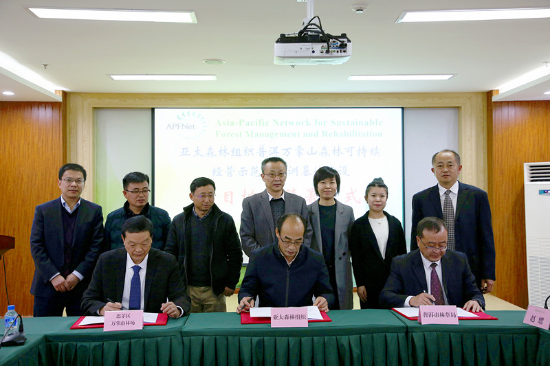 On 14 January 2020, the project agreement signing ceremony was held at the APFNet Kunming Center in China. Mr Cai Maowei, the Deputy Director of Pu’er Forestry and Grassland Bureau, Mr Chen Wenjie, the Director of Wanzhangshan Forest Farm and Dr Lu De, the Executive Director of APFNet signed a three-party project agreement, which will establish a second APFNet Training Centre in addition to the first one located in Wangyedian Forest Farm, located in Inner Mongolia, China, under a different project (/en/show-list-987.html).