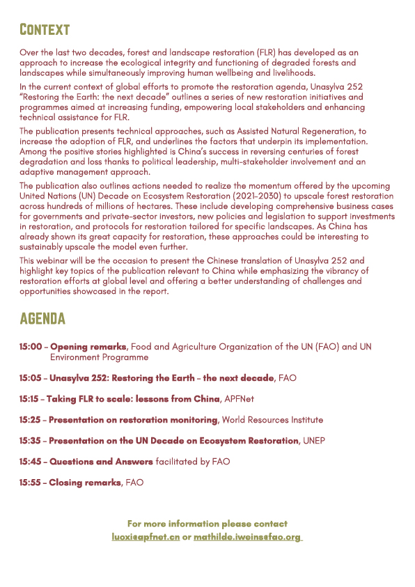Don’t miss the webinar at 15:00–16:00 (Beijing, UTC+8) 29 March 2022 for the launch of “Restoring the Earth: the next decade” Unasylva 252 Chinese version!