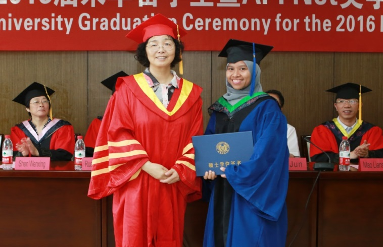 On 24 June 2016, nine students at Nanjing Forestry University (NFU) successfully graduated from the APFNet Scholarship Program (ASP). The students were the first graduating class at NFU since the program’s initiation at the university in 2014.