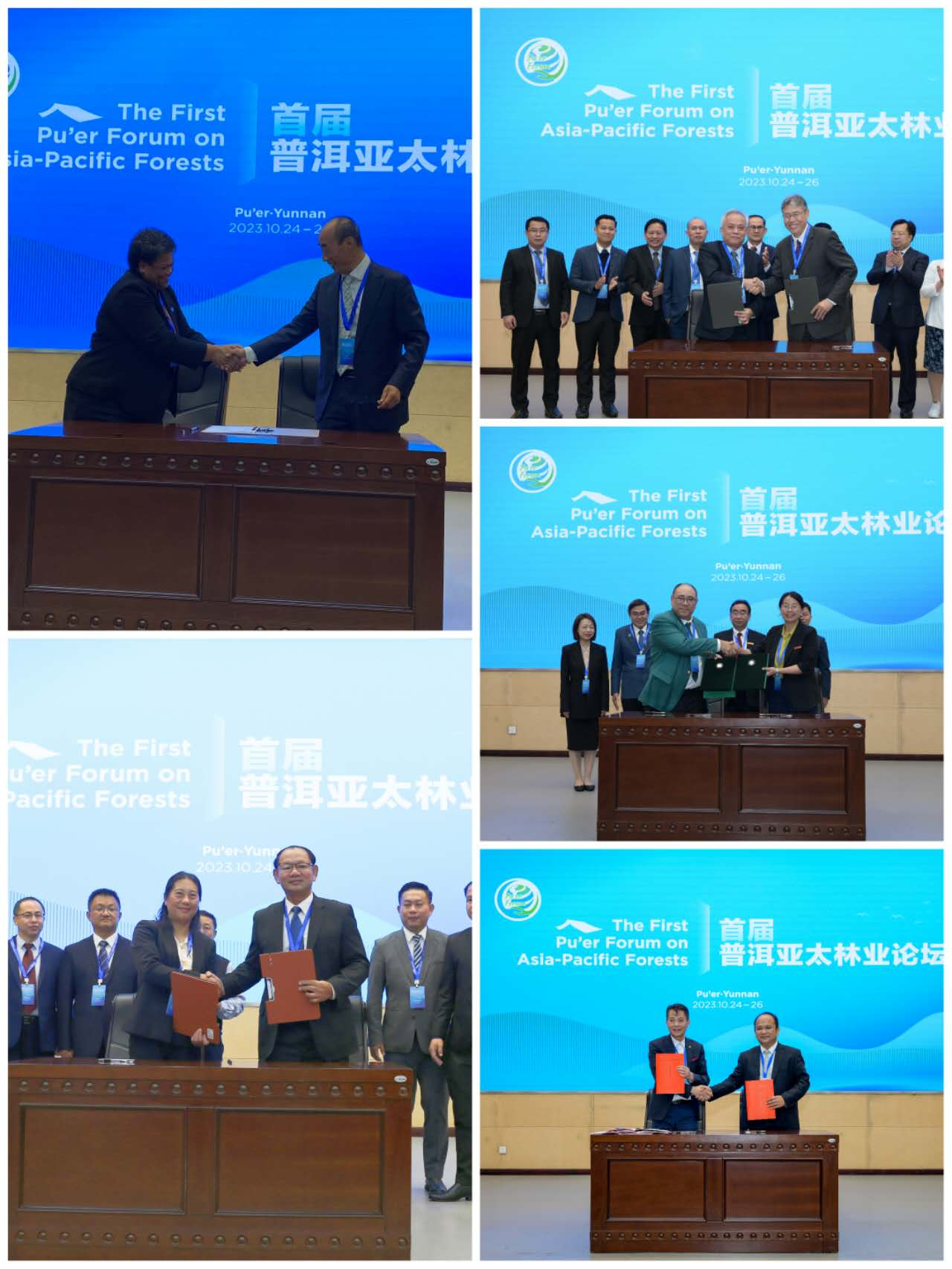 The Forum also witnessed an MoU signed between APFNet and the Ministry of Fisheries and Forestry of Fiji on Promoting the Sustainable Development of the Sandalwood Industry in Fiji, and another 4 cooperation agreements signed between the Yunnan Academy of Forestry and Grassland and the Cambodian Institute of Wildlife Research, the Southwest Forestry University and the Kasetsart University of Thailand, the China National Forestry Industry Association and the Laos National Forestry Industry Association, and the Pu'er Municipal Government and the Nature Wood Group Limited.