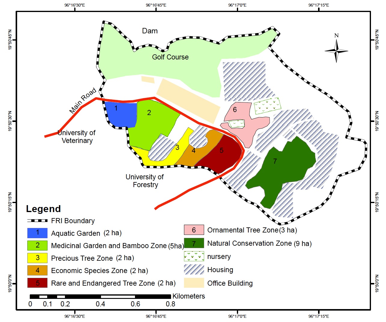 This project is establishing Myanmar’s first arboretum inside the Forest Research Institute (FRI) in Yezin, Nay Pyi Taw, central Myanmar, building upon an existing medicinal garden and secondary natural forest (see Fig.1). The purpose of the arboretum is to collect and improve forest genetic resources for sustainable management and forest biodiversity conservation. In addition, the arboretum will be a centre for education on forestry and environmental awareness, serving as a demonstration site for different forest landscapes.