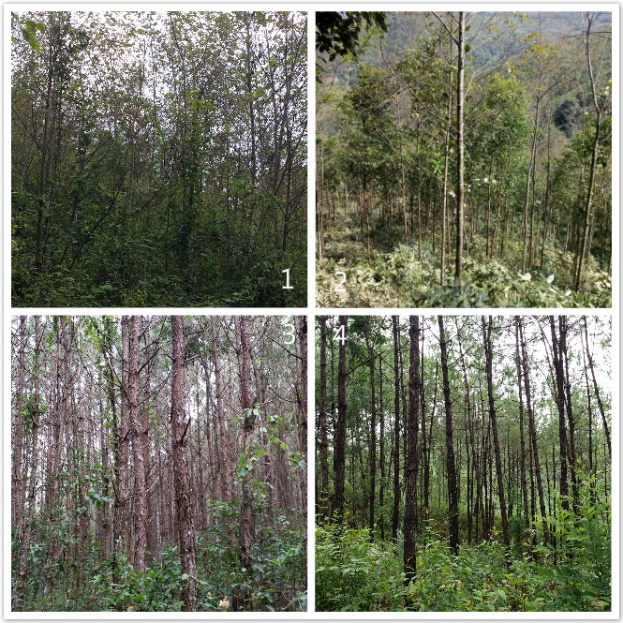 Figure 2. Before (photo 1) and after (photo 2) forest management of Betula alnoides commercial forest; Before (photo 3) and after (photo 4) forest management of Pinus kesiya non-commercial forest. Photos: Wanzhangshan Forest Farm