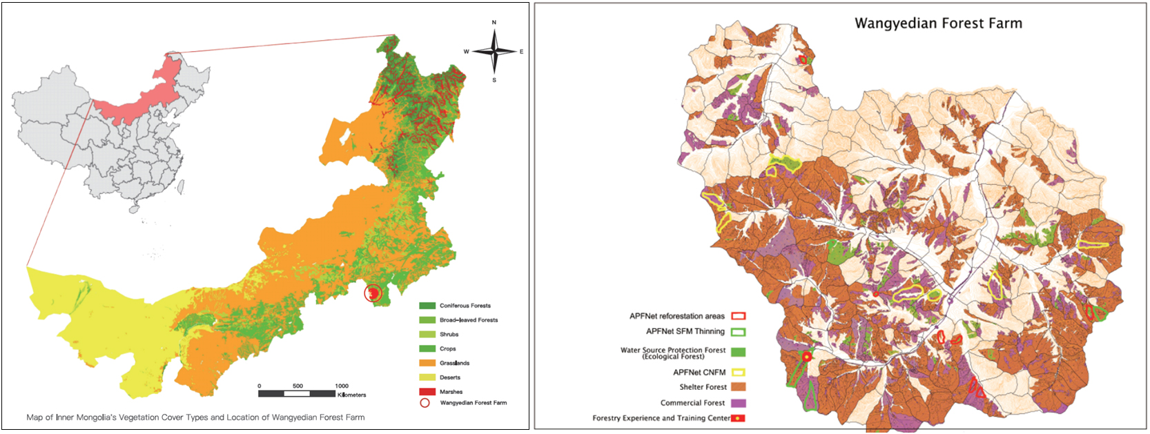 Over recent decades, China has established one of the largest reforestation programmes globally. While the re-establishment of green cover in China is not finished, it is time to look beyond just planting trees. Both historical conditions as well as a lack of knowledge and available technologies have limited the range of silvicultural practices used for re-establishing forests. As a result, China’s current planted forests largely consist of monocultures, with impeded ecosystem functions and limited biodiversity. Such is the case in Wangyedian Experimental Forest Farm in Inner Mongolia. Government authorities have now recognized the need to introduce new management practices that value community participation and utilize multiple forest functions, to ensure the sustainable production and health of the forest. In 2011, APFNet launched the first phase of the project “Construction of multifunctional forest management demonstration” in Wangyedian Forest Farm, to demonstrate the multifunctional forest management approach and explore how economic, social and environmental benefits can be balanced and enhanced, both at the farm and in the wider region. The project developed forest management plans and demonstration plots to be managed under multifunctional close-to-nature forest principles and employed co-management mechanisms for the forest farm and the local community. To ensure the success of this cooperation, building the capacity of local communities to participate in the management of forests was undertaken.