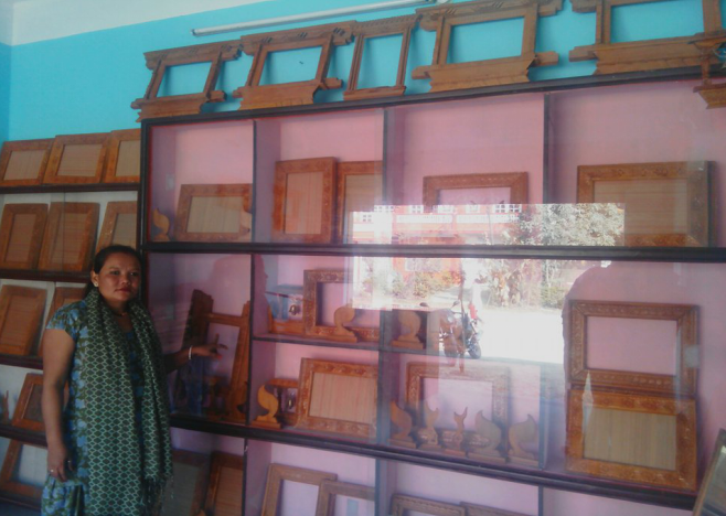 Previously she made a living carrying bricks which was extremely exhausting and bad for her health. Although she worked very hard every day, the income was low and it was still very difficult to afford her children’s education. Wanting to learn new skills and improve her income, she joined the Piple Pokhara Community Forest User Group two years ago and was selected for wooden handicraft training, the first round of six months of basic training. Showing a strong work ethic, she then completed a five-month advanced training course, specializing in producing wooden frames. Sarita also continued working with the community forest user group, undertaking a variety of jobs, such as helping to cut logs and designing frames based on customer specifications. The frames are sold by the community forest user group and the income is distributed to members from a group bank account. One of Sarita’s proudest achievements was when her handicraft was chosen to be exhibited during World Wood Day in 2015.