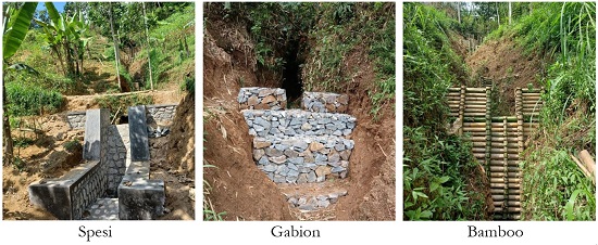 In addition, over 20 different gully erosion control structures were built, such as bamboo plugs, gabion head structures and small check dams using “spesi" (a cement-stone material) at existing rehabilitation sites in the micro catchment management plan (Fig.3).