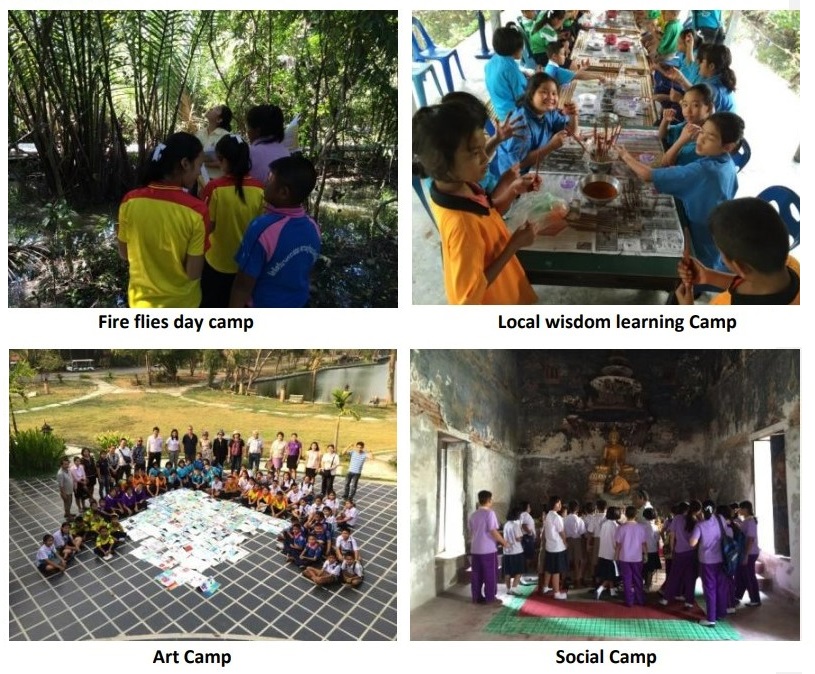 The exhibition and interpretive center were established in Suan Pa Ket Nom Klao Urban Community Forest (UCF) as an activity base of the community to organize field trips for children and organizations and a community eco-tourism program for Bangkok day trippers and visitors. The long-term sustainability of Bang Kachao has been linked to ecotourism by improving facilities and interesting stories (i.e., culture and norms) in order to increase visitor numbers. Therefore, semi-permanent facilities and constructions, such as a bamboo boardwalk, a wooden hut with a root of Nypa palm leaves for a learning station about natural dye, an information center, and a community forestry nursery were set up within Bang Kachao to preserve and harmonize with nature as much as possible. Then, education programs related to local curriculum practices have been developed with training camps such as a fireflies’ day camp, local wisdom learning camp, art camp, social camp, sports day, and field trip activities for local teachers and children (see Fig.2). This activity aims to help school children to develop the critical thinking they need to understand the importance of natural resources. It also encourages children to act on their own to conserve natural resources and use them responsibly.