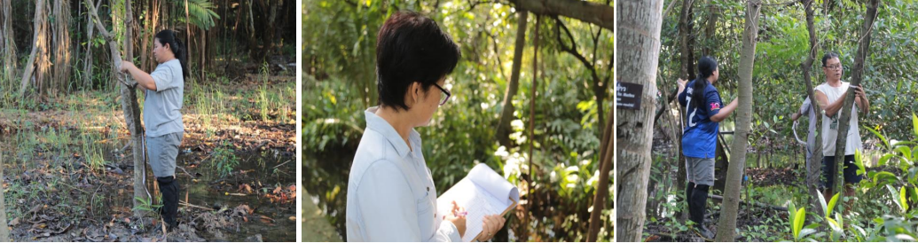 Ecotourism sites should be comparatively rich in biodiversity, and, more importantly, the habitat should reflect what is commonly understood as “natural” for the area. A plant and bird species survey was conducted to establish baseline information for conservation sites feeding endemic fauna within Suan Pa Ket Nom Klao Urban Community Forest (UCF). RFD officials, local communities in the study area, and children from Pa Ket Nom Glao local schools carried out the survey. Given that much of Bang Kachao has been used by local people for coconut plantations and other agriculture, it was essential to restore the original flora and fauna of the area. Fig.5 shows that local community members were trained to conduct plant species surveys.