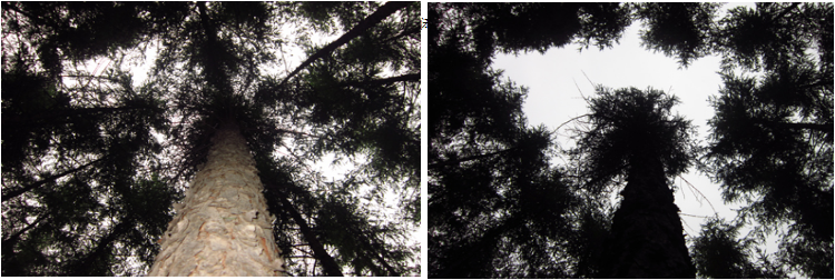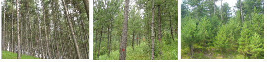 图表4 图为油松经营前的单层林分(左)、油松目标树单株培育(中)和油松经营后形成的复层林(右)。(摄影 马成功/旺业甸林场)