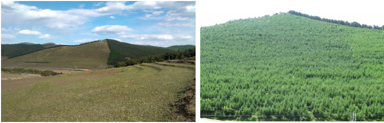 图表5图为造林前的宜林地(左)和造林后郁闭的幼林(右)。(摄影 马成功/旺业甸林场)