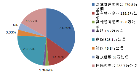 越南是社会主义经济体,根据1988年颁布的《土地法》,越南实行土地国有制,私人不可拥有土地,政府仅通过划拨、租赁和承认土地使用权的方式对森林和土地资源进行开发利用。1993年修订《土地法》后,颁布了红色认证书,将森林分配给国有企业、军队、社会组织、合作社、农场、农林生产队进行长期使用,其中林权期限是50年。截至2014年,政府规定全国有8个参与直接森林管理的利益相关方,即森林管理委员会、国有林业企业、其他经济组织、军队、家庭、社区、群众组织和居民委员会。其中,国有组织管理着7.43万公顷森林,占森林总面积的54.01%;私人,如经济组织、个人、家庭和社区管理着3.99万公顷森林,占森林总面积的29.07%;而居民委员会管理着2.33万公顷的森林,占16.92%。图1 林地使用类型