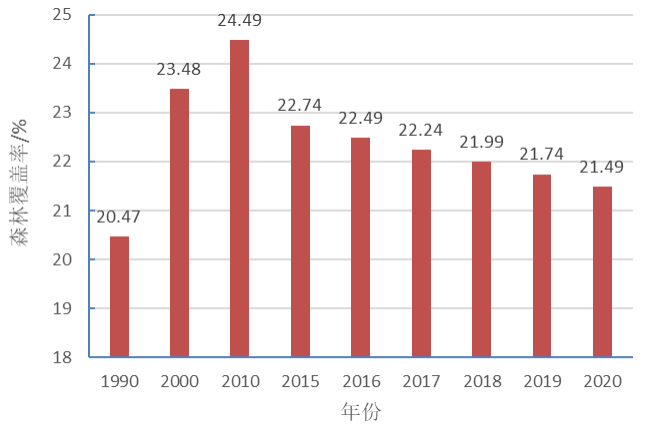 | 森林覆盖率/% | 20.47 | 23.48 | 24.49 | 22.74 | 22.49 | 22.24 | 21.99 | 21.74 | 21.49 |