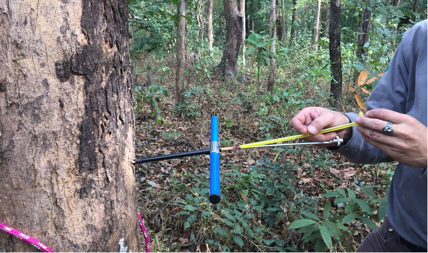 第一年(2017年)的项目主要工作内容为现场数据收集。在泰国南邦府(Ngao)示范林3×3公里区域内,选定了 54个采样区,对样本树种、树干胸径(DBH)、树高和木材密度等数据进行测量记录,并将样本树的数据(底面积、树种数量、按树种划分的木材密度、重要性价值指数(Important value index IVI)汇总为平均值和每公顷数据。
