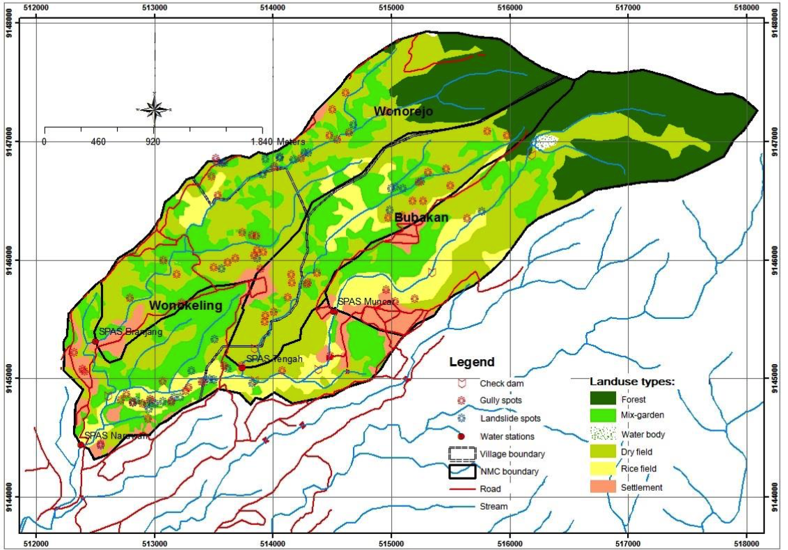 本项目的示范地位于纳鲁安(Naruan)微流域(NMC)的3个村庄,分别是喀让甘亚(Karanganyar)区的沃热臼(Wonorejo)和吴客林(Wonokeling)村,以及沃诺瑞(Wonogiri)区的埠巴坎(Bubakan)村。项目将设置两类植被示范区,进行保护性农业和农林复合经营,以减少水土流失问题,其中一类是参与式土地示范区,另一类是非参与性土地示范区。在参与性土地示范区内,项目将根据实地测量把用材树种、多用途树种和季节性作物组合,开展混农林经营。非参与性示范区将由在第一阶段生长较好的树种或作物组成,该示范区的建设不是以参与式的方式进行的,而是由印度尼西亚水流域管理技术中心(WMTC)直接管理,与第一类参与式土地示范区形成对比。项目还将建设23个冲沟侵蚀控制装置,包括20个沟塞和竹质坝头,以及三个用“spesi”(印尼语,一种水泥石材)建成的小型拦淤坝。这些水土保持工程将建在微型流域管理计划中已经存在的修复区内(图2)。
