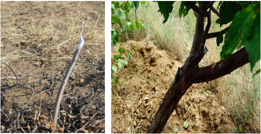 图5 山杏改接大扁杏嫁接初期(左)及嫁接效果 (右)
